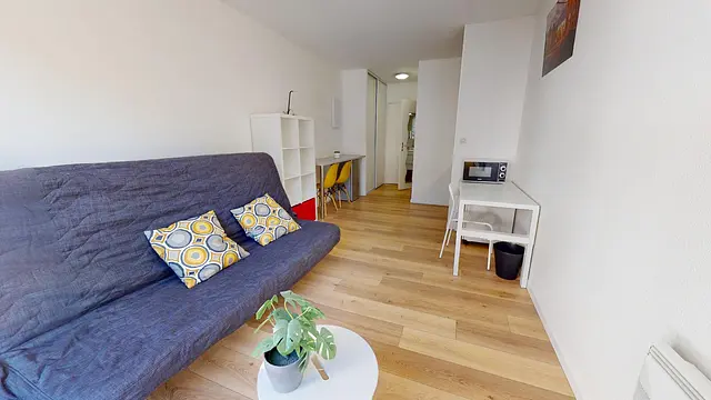 Ce studio comporte une pièce de vie avec un canapé convertible, une table basse, une table, un bureau et une kitchenette.