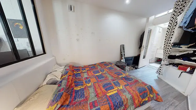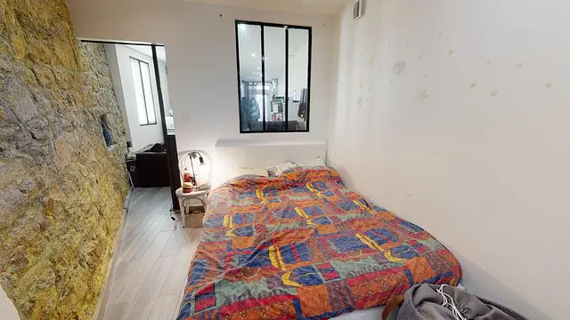 La chambre est séparée du salon par une belle cloison de type industrielle, elle est idéalement équipée avec lit double, et rangements.