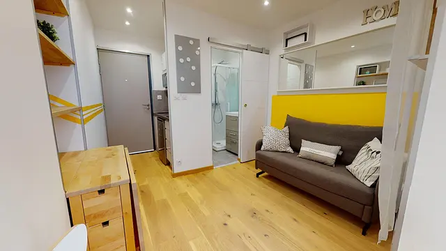 Composé d’une pièce de vie unique, ce studio est décoré et agencé avec goût.
