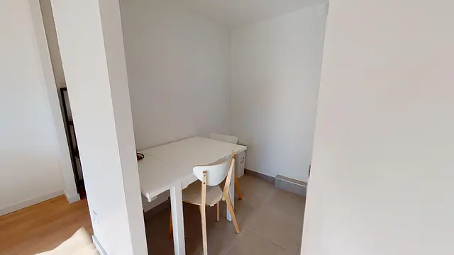 L’appartement comprend également une pièce de vie lumineuse aménagée avec un lit simple convertible en lit double, un bureau, une chaise, une table basse et des rangements (dans le couloir).