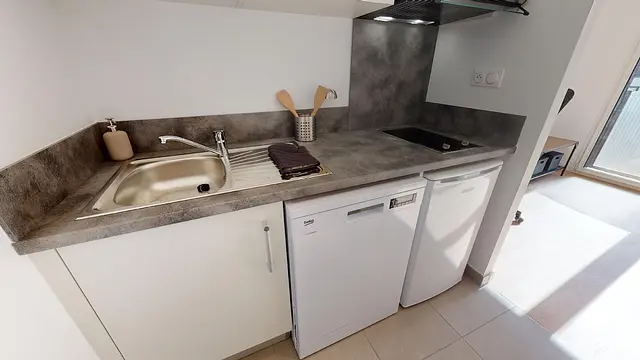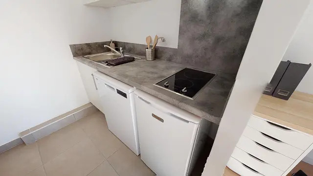 La cuisine quant à elle est séparée mais semi-ouverte sur la pièce de vie. Cette cuisine est équipée avec des plaques de cuisson,, un lave vaisselle, un frigo, un micro-ondes, une hotte; des rangements, etc.