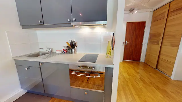 Ce studio se compose d’une cuisine ouverte sur un salon, d’un espace de nuit muni de son lit double et d’une salle de bain. Celle-ci dispose d’une machine à laver, d’un meuble vasque, et d’une douche. Le salon est agencé d’un canapé, d’une table à manger, d’un bureau, d’une table basse et d’un meuble TV.