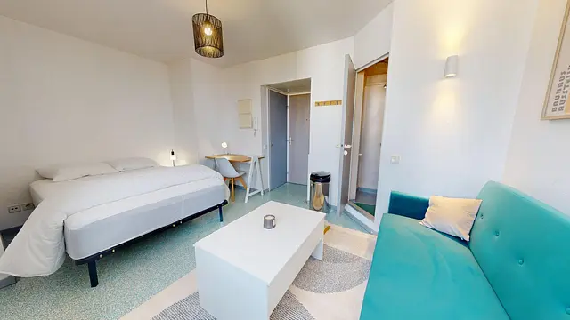 Ce studio s'ouvre sur une pièce de vie aménagée d'un canapé, d'une table basse, d'un lit double, d'une table de chevet avec une lampe, d'une bibliothèque murale ainsi que d'un bureau avec une chaise et une lampe. La cuisine ouverte est équipée d'un micro-ondes, d'une bouilloire, d'un réfrigérateur, de plaques de cuisson ainsi que d'un placard mural.