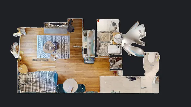 Ce studio se compose d’une entrée, d’une salle de bain, d’une cuisine ouverte sur un espace de vie transposable en espace de nuit grâce à son canapé dépliant. La cuisine est bien équipée plaques de cuisson, four, hotte, etc.), et le salon dispose d’une TV et d’un ensemble de tables basses pour compléter le canapé. Une table à manger, deux chaises et un lampadaire viennent parfaire ces espaces. La salle de bain du logement dispose d’un meuble vasque, d’une machine à laver, et d’une douche.