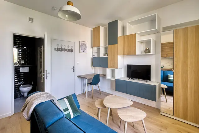 Dès l’entrée dans ce logement entièrement rénové, vous découvrez un espace fonctionnel et moderne où chaque détail a été pensé pour votre confort . Le séjour, décoré avec soin, propose un canapé convertible de qualité permettant de transformer facilement l’espace en coin nuit. Un fauteuil, des tables basses et un espace TV viennent compléter cet ensemble chaleureux et accueillant.