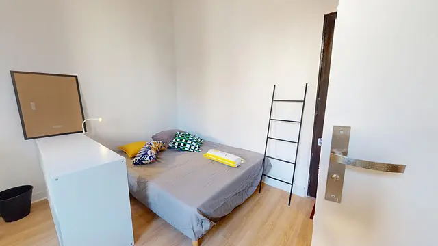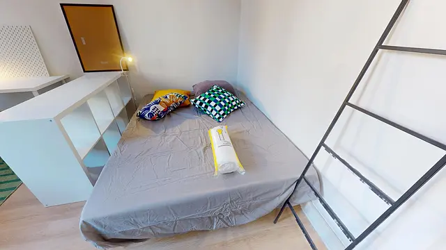 L’appartement est équipé et meublé. Il est composé d’un coin cuisine (plaques de cuisson, frigo, four micro-onde, vaisselle et ustensiles, rangements), une salle de bain avec WC, un espace bureau et un lit double (matelas 140x190 neuf) et dispose de rangements.