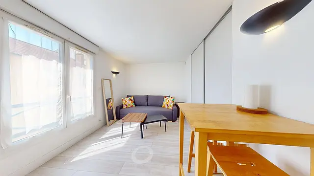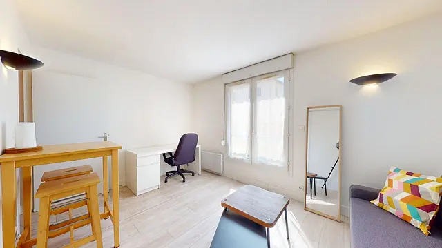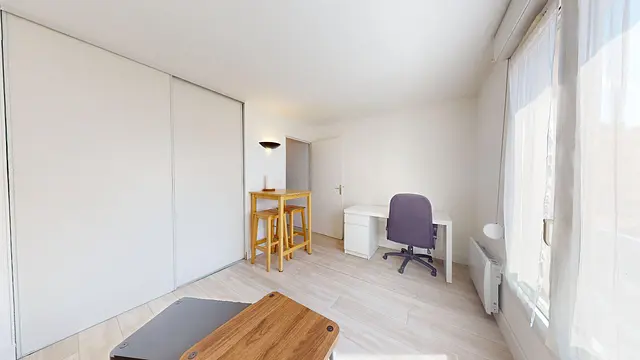 Ce studio lumineux est aménagé avec un espace de vie fonctionnel comprenant un canapé, une table haute avec ses tabourets, un bureau et de nombreux rangements. La décoration sobre et moderne, associée au parquet clair, apporte une atmosphère chaleureuse et conviviale.
