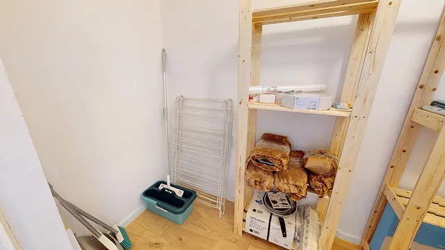 La porte d’entrée de ce logement s’ouvre sur un couloir qui dessert les WC séparés, une buanderie avec des étagères, des chaises, du matériel, etc. et la salle de bain avec baignoire et meuble vasque. La salle de bain comporte une arrivée d’eau, il est alors possible d’installer une machine à laver.
