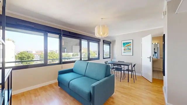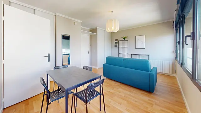 Ce studio s'ouvre sur une pièce de vie aménagée d'un canapé convertible en lit double, de deux meubles étagères, de deux placards muraux ainsi que d'une table avec quatre chaises.