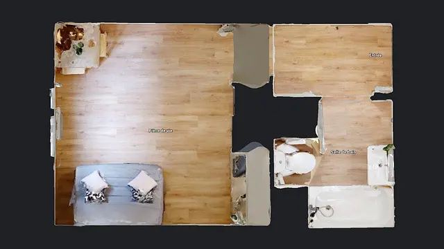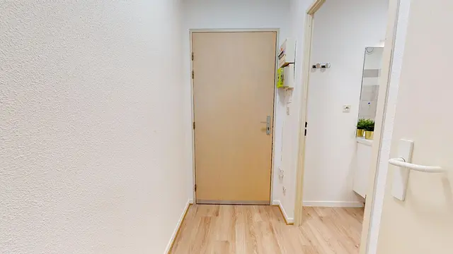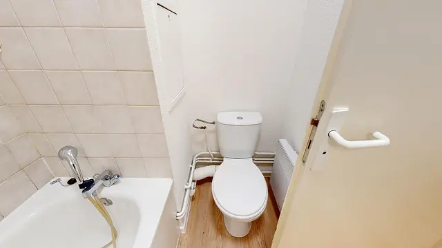 La porte d’entrée de ce studio s’ouvre sur un couloir qui dessert la salle de bain avec baignoire, WC et meuble vasque ainsi que la pièce de vie.