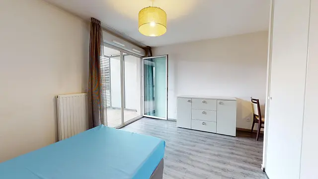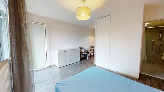 Pour le studio, vous trouverez une pièce lumineuse. La porte d'entrée est située à coté de la cuisine. La cuisine est équipée de plaque de cuisson, un évier, une hotte, d'un réfrigérateur, de rangement et d'une table à manger. Par la suite, la pièce de vie se compose d'un lit double, de deux tables de chevet, d'un placard.