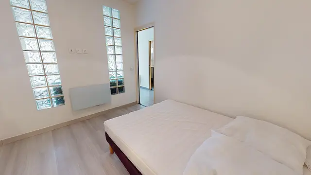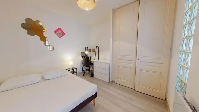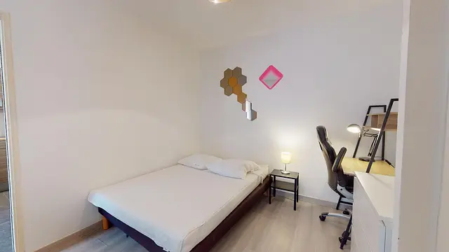 La chambre, équipée d’un parquet, comporte un lit double, une table de nuit avec lampe de chevet, un grand placard mural et un bureau.