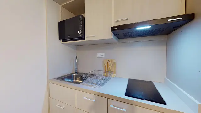 Vous trouverez aussi dans cet espace une belle cuisine ouverte et toute équipée (Micro-onde, Frigo, 2 plaques électriques, hotte, ainsi que de nombreux rangements).