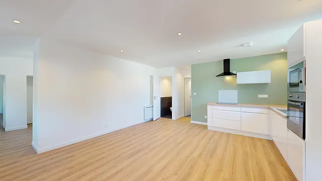 L'appartement s'ouvre sur une entrée desservant un lumineux séjour avec cuisine ouverte. Celle-ci est équipée d'un four, d'un micro-ondes, de plaques de cuisson, d'une hotte et de nombreux rangements.