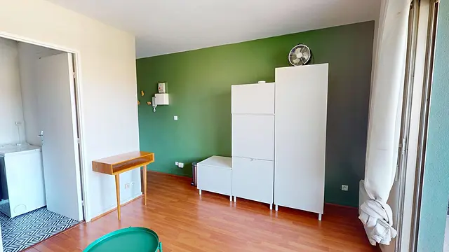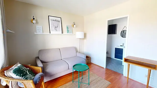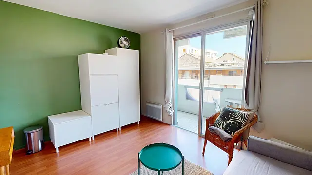 Le logement se compose d’une pièce de vie lumineuse, aménagée avec un canapé convertible, une table basse et un petit fauteuil, ouvrant sur un balcon agréable pour profiter des beaux jours. Un placard de rangement complète l'espace pour plus de praticité.