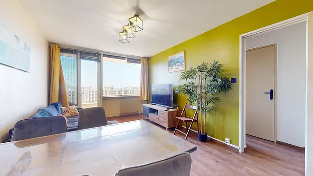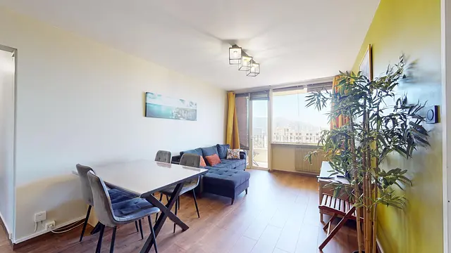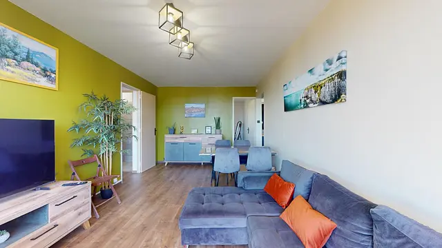 Un vaste salon vous attend, parfaitement aménagé avec un canapé, un meuble Tv avec sa télévision, une table avec ses quatre chaises et un meuble de rangement. Un espace idéal pour se détendre ou recevoir vos invités. Les espaces de vie sont baignés de lumière naturelle grâce à une porte-fenêtre qui s'ouvre sur une loggia équipée d'une table avec deux chaises et un fauteuil. Vous offrant un coin extérieur agréable et ensoleillé.