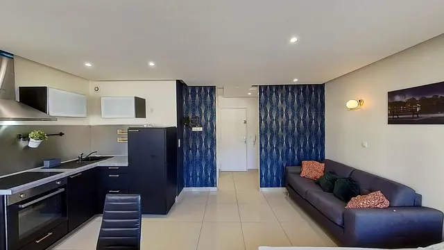 L'appartement, aménagé avec goût, est composé d'une pièce de vie, équipée d'un canapé, d'une table, de deux chaises, d'un lit double et d'un coin cuisine.