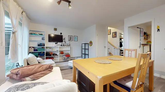La pièce de vie, baignée de lumière naturelle, s’ouvre directement sur le jardin. Elle est meublée avec un canapé, des fauteuils, une bibliothèque, un grand placard de rangement ainsi qu’une table à manger pour vos moments conviviaux en famille ou entre amis.