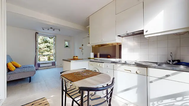 Ce studio se compose d’une cuisine ouverte sur une pièce de vie transposable en pièce de nuit et d’une salle de bain. La cuisine est très bien équipée ( micro-ondes, plaques de cuisson, hotte, table à manger, etc.) et le salon dispose d’un canapé dépliant en lit double.