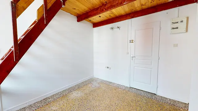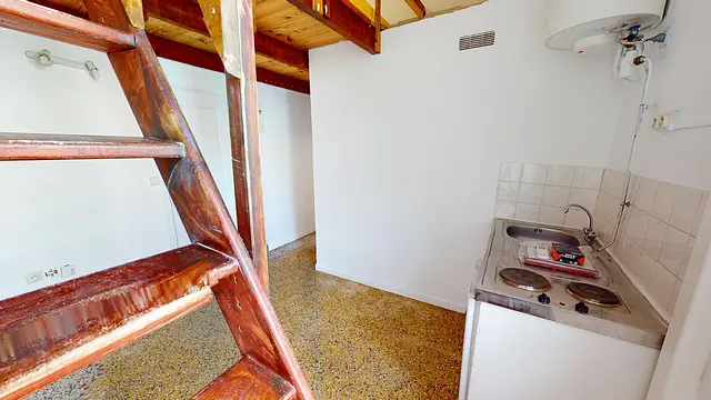 Ce logement comporte une mezzanine accessible par des escaliers en bois. Cet espace peut facilement être aménagé en espace nuit avec lit, bureau et rangements.
