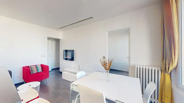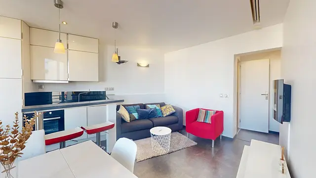 L'appartement s'ouvre sur une entrée avec rangements. Elle dessert une pièce de vie avec cuisine ouverte disposant d'un canapé, d'un fauteuil, d'une table basse, d'un meuble TV et d'une table avec 3 chaises.