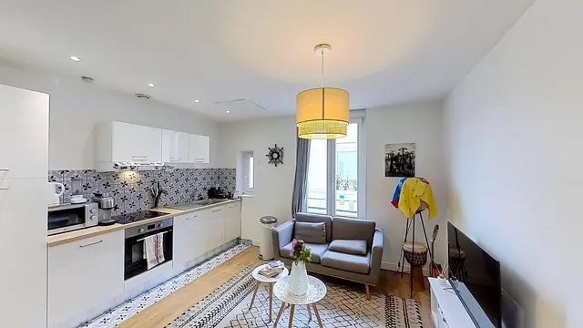 L’appartement dispose d’un salon lumineux, équipé d’un canapé, de tables basses, d’une télévision et d’une table à manger.