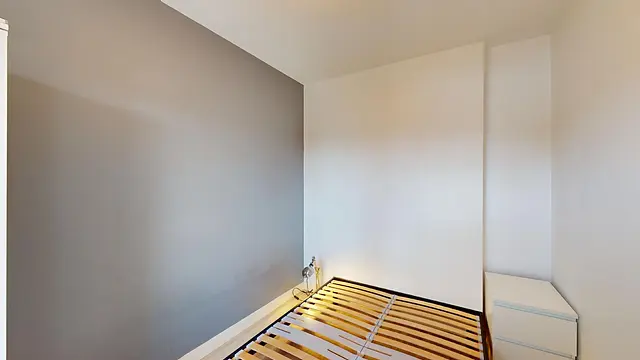 Le coin nuit est aménagé d'une table de chevet, d'un sommier, d'une lampe et d'une armoire.