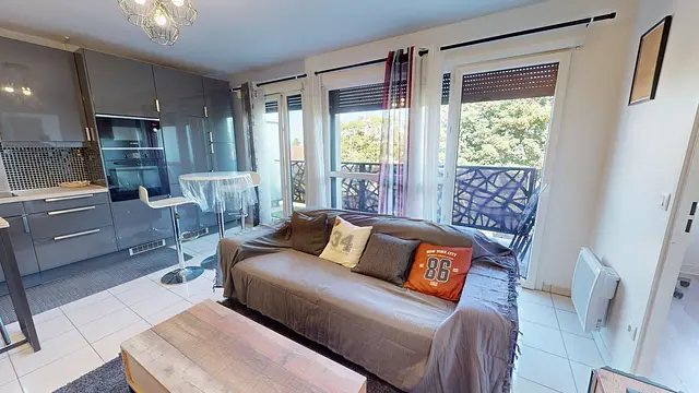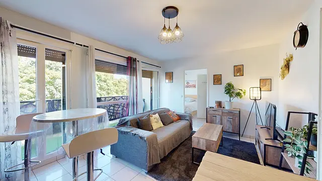 La pièce de vie est meublée avec un canapé, une table basse, un meuble TV, une télévision, des meubles de rangement, ainsi qu'une table haute accompagnée de deux tabourets. Elle s'ouvre sur un balcon de 7m² offrant une jolie vue dégagée.