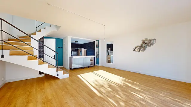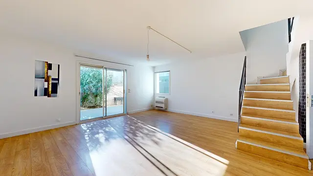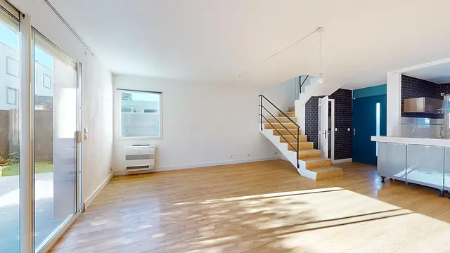 Au rez-de-chaussée, elle s'ouvre sur une grande pièce à vivre très lumineuse qui donne accès au jardin grâce à une baie vitrée.