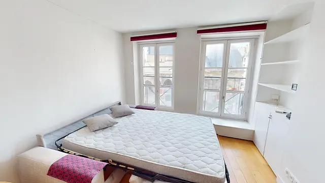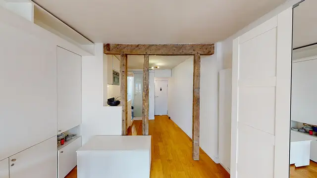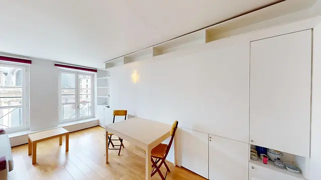 Ce studio se compose d’un espace cuisine, d’une pièce de vie transposable en espace de nuit grâce à son canapé convertible en lit, et d’une salle de bain munie d’un meuble vasque, d’une douche, d'un lave-linge et d’un WC. Vous noterez le charme des poutres apparentes dans la pièce de vie, mais aussi de la salle de bain disposant d'une ample douche à l'italienne. Enfin, une table accompagnée de deux belles chaises ainsi qu’une armoire de rangement et plusieurs placards viennent compléter ces espaces. L'appartement propose des menuiseries sur mesure.