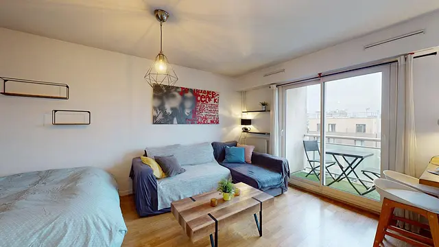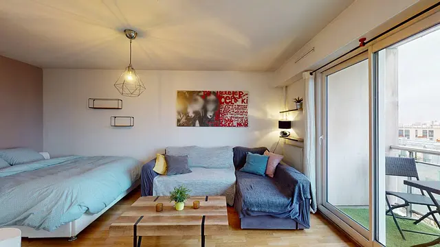 La pièce de vie, lumineuse grâce à une large baie vitrée, s’organise autour d’un espace salon aménagé avec un canapé d’angle et une table basse. Le sol en parquet clair et les murs blancs apportent une ambiance sobre et contemporaine. L’espace nuit est intelligemment intégré dans la continuité de la pièce principale, avec un lit installé sur une estrade, permettant une bonne séparation des volumes tout en conservant une belle sensation d’espace.