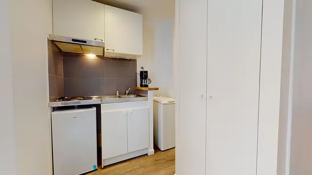Ce studio dispose d’une entrée, d’une cuisine ouverte sur un espace de vie muni de sa table à manger, d’un espace de nuit muni d’un canapé convertible en lit, d’un WC et d’une salle de bain indépendante. La salle de bain dispose d’un meuble vasque et d’une douche. La cuisine est équipée d’un frigidaire, de plaques de cuisson, d’une hotte ainsi que de plusieurs rangements. Une machine à laver se trouve aussi accolée à la cuisine.