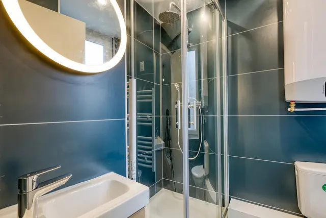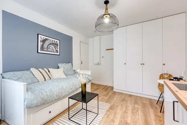 un joli studio, composé d'une belle pièce avec cuisine entièrement équipée (plaques de cuisson, hotte, micro-onde, vaisselle, batterie de cuisine, réfrigérateur et congélateur, machine à laver), d'un lit - canapé avec rangements intégrés, de nombreux rangements, et d'un salle de douche avec wc.