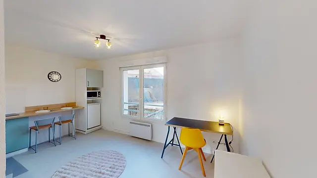 Le studio se compose d’un espace de vie lumineux, joliment agencé avec un coin nuit, un bureau, et des rangements ouverts.