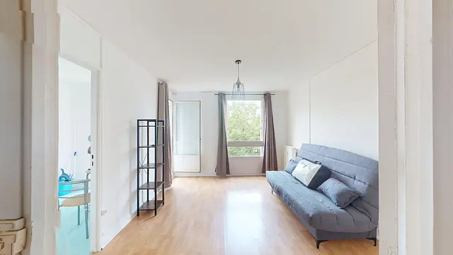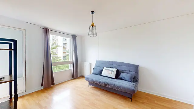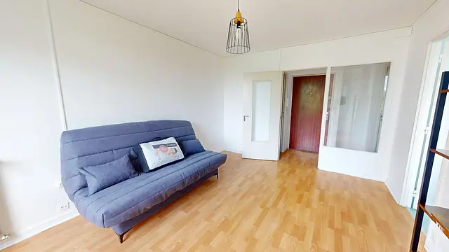 Ce lumineux T1 s'ouvre sur une pièce de vie aménagée d'un canapé convertible en lit double ainsi que d'une bibliothèque.