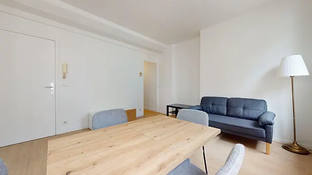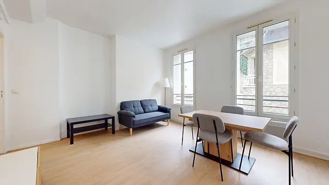 L’appartement s’ouvre sur une pièce de vie lumineuse, aménagée avec un canapé, une table basse et une table à manger accompagnée de chaises. Les grandes fenêtres apportent une belle clarté et donnent sur un environnement arboré, créant une atmosphère paisible.