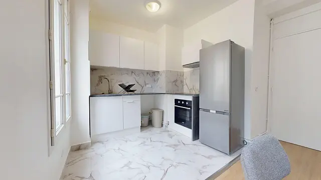 La cuisine ouverte dispose de meubles de rangement hauts et bas, d’un plan de travail fonctionnel et d’un équipement complet comprenant un four, des plaques de cuisson et un réfrigérateur. Le revêtement en marbre clair au sol et en crédence apporte une touche moderne à l’ensemble.