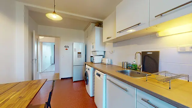 La cuisine est pourvue d'un réfrigérateur-congélateur, d'un four, d'un micro-onde, d'une bouilloire, d'un grille-pain, de plaques de cuissons, d'une hotte aspirante, d'un lave-vaisselle, d'une machine à laver ainsi que de placards de rangement et pour terminer d'une table à manger avec des chaises. Vous disposez d'un balcon avec une table à manger pour profiter des repas ensoleillés.