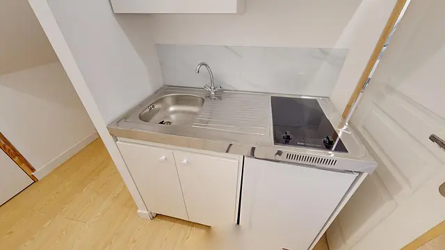 La porte d'entrée de ce logement s'ouvre sur la kitchenette équipée avec un frigo, une plaque de cuisson, un micro-ondes, un évier.