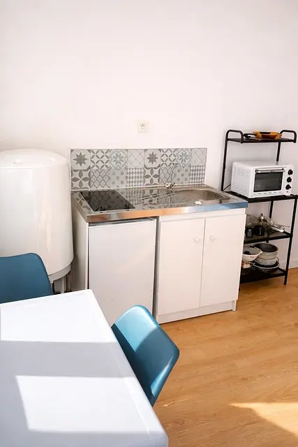 La pièce de vie du logement est aménagée avec une penderie, une table à manger/table basse, des chaises , une kitchenette et un canapé. Cette kitchenette est équipée avec plaques de cuisson, micro-ondes, frigo, évier.