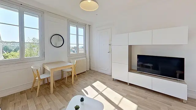 La porte d'entrée de ce logement s'ouvre sur une pièce de vie lumineuse. Elle dispose d'un canapé convertible, d'une table basse, d'un meuble TV avec rangement, d'une TV, de grands placards de rangements et d'une table à manger avec 2 chaises.