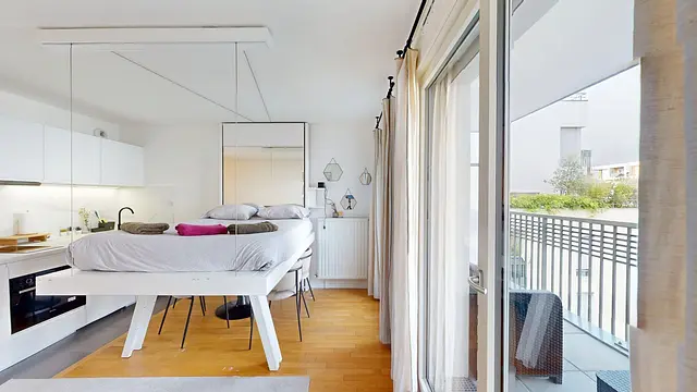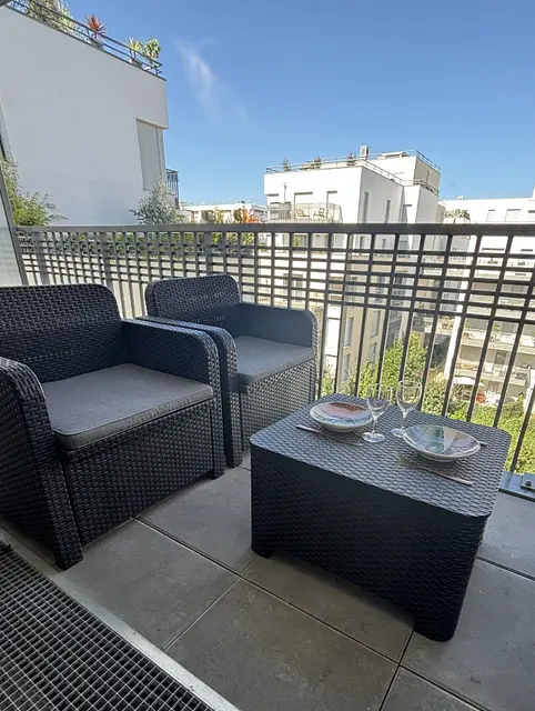 Un balcon aménagé avec du mobilier d’extérieur vient compléter ce logement.