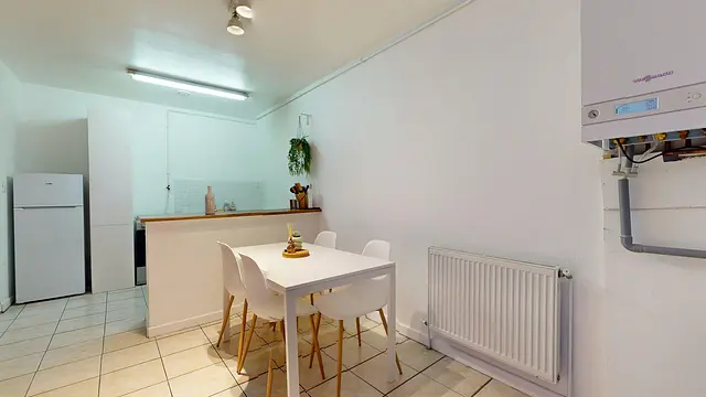 La pièce de vie est aménagée avec une table à manger et des chaises, idéales pour vos moments conviviaux.
