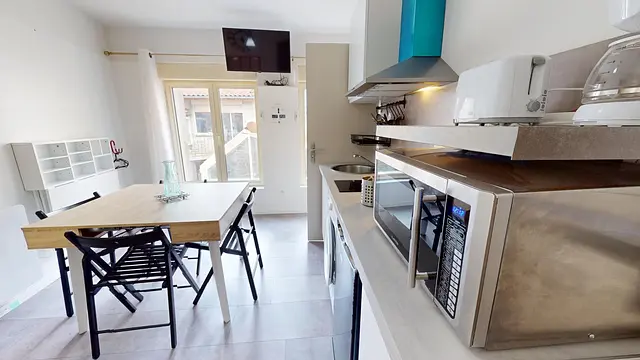 - Une pièce de vie lumineuse avec un canapé, une table à manger avec ses chaises. Une cuisine spacieuse avec un réfrigérateur, un micro-ondes, des plaques de cuisson, une hotte, un évier ainsi que de nombreux rangements et une télévision. Cet espace est très lumineux grâce à deux grandes fenêtres.