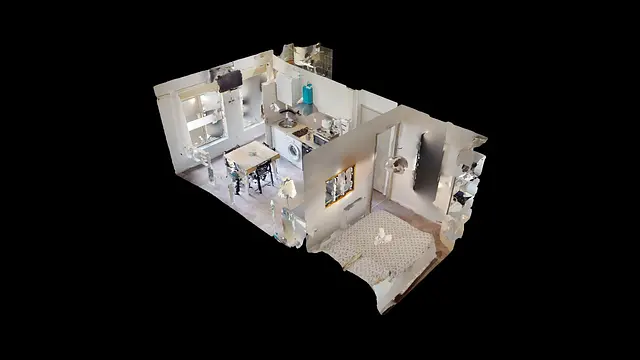 - Une chambre avec un lit double, un miroir et des étagères vient compléter cet appartement.