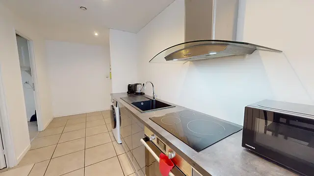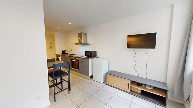 Cet appartement s'ouvre sur une pièce de vie avec un coin séjour et un coin cuisine. La cuisine est équipée d'une machine à laver, d'une machine à café, d'une bouilloire, d'un évier, d'un four, d'un micro-ondes, d'un réfrigérateur, de plaques de cuisson avec une hotte ainsi que des rangements.