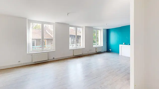 La pièce de vie principale offre un vaste espace avec une touche de bleu sur l'un des murs. Les grandes fenêtres laissent entrer généreusement la lumière naturelle, créant une atmosphère conviviale.