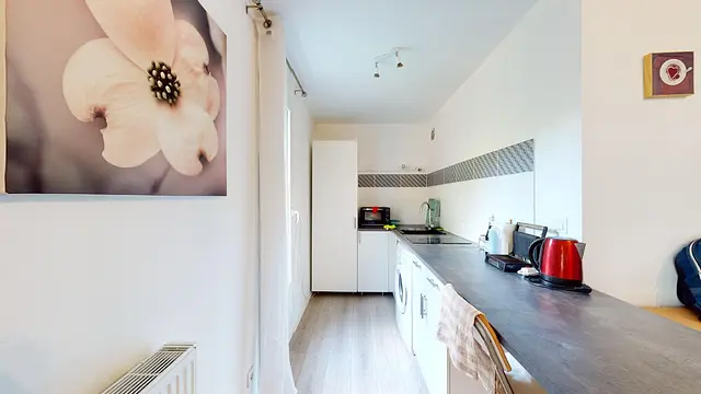 La cuisine est bien équipée munie de ses plaques de cuisson, d’un four d’appoint, d’une machine à laver, d’un plateau de travail et enfin un espace table haute accompagnée d’une chaise de bar. Deux petits balcons sont accessibles depuis la pièce de vie et la cuisine. Enfin, la salle de bain dispose d’un meuble vasque, d’un WC et d’une baignoire.