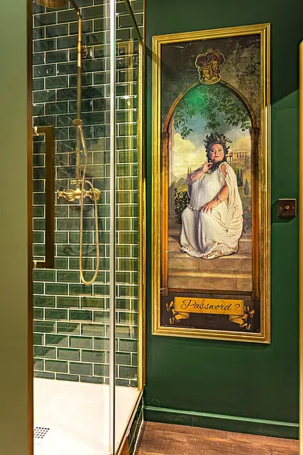 Salle d’eau secrète (accessible si vous connaissez la bonne magie 🪄) : douche, meuble vasque avec miroir, sèche-serviette, rangements et WC.