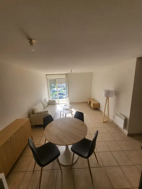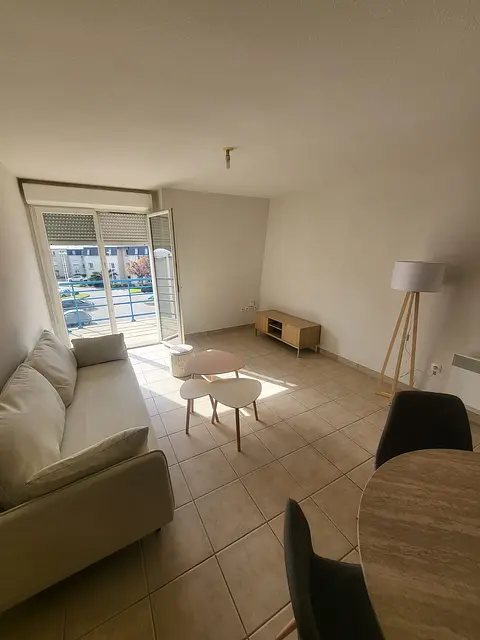 La pièce de vie, lumineuse et spacieuse, s'ouvre sur un balcon privé. Elle est aménagée avec un canapé, une table basse, un meuble TV ainsi qu'un espace salle à manger comprenant une table ronde et des chaises design.